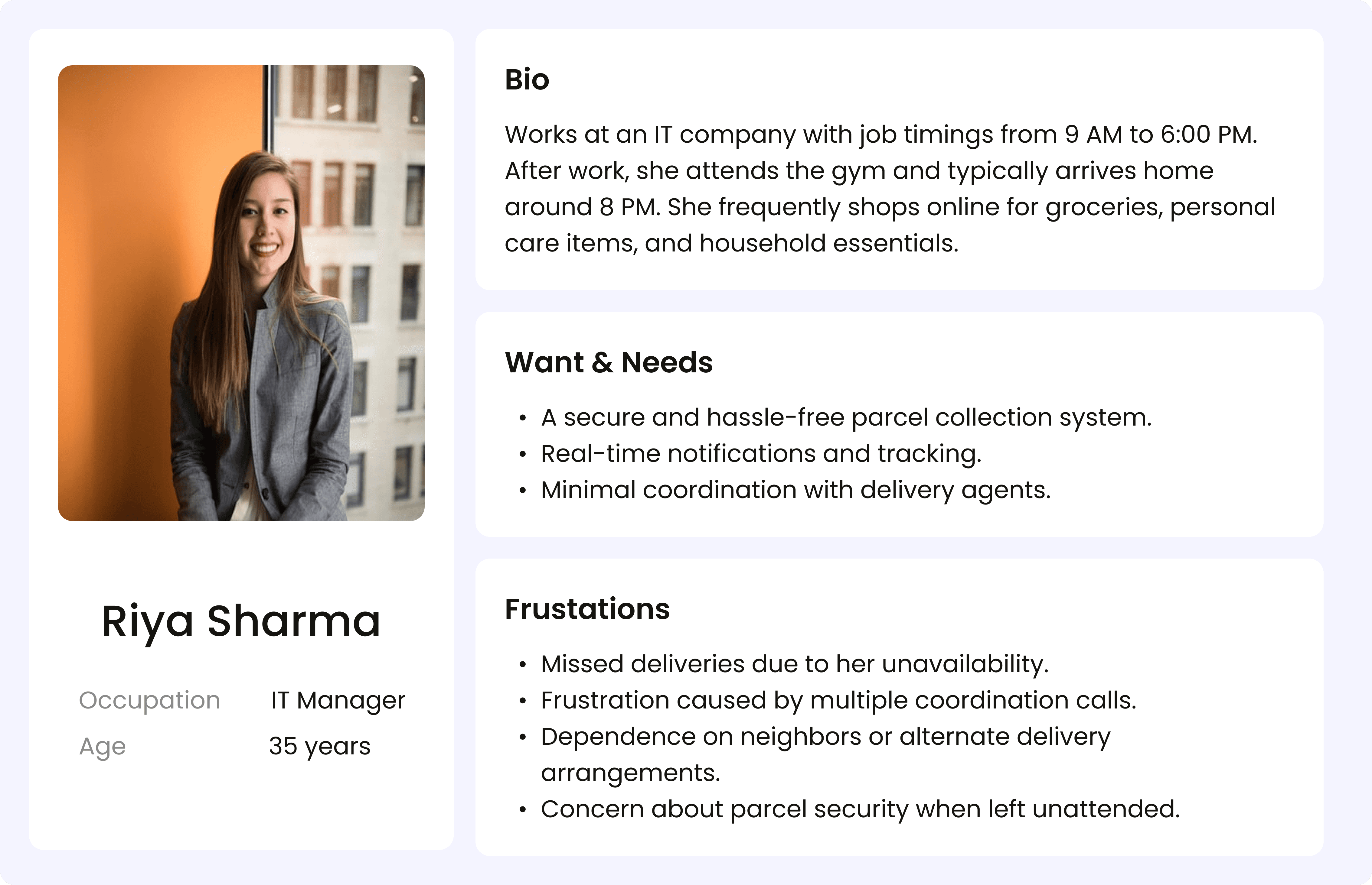 Pain Points: Faces missed deliveries, excessive coordination calls, dependency on neighbours, and concerns about unattended parcel security.