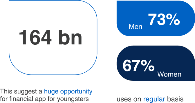 Financial apps are used regularly by 73% of men and 67% of women, signifying a gender-inclusive growth.
